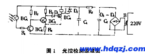 圖1是光控檢測原理圖。BGl為光敏三極管.有光照射時導通,無光照射時截止。